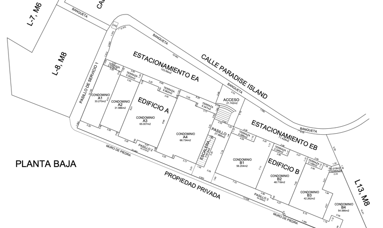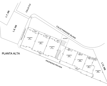 La planta alta comprende los departamentos en su ala izquierda A1, A2, A3, A4 y en su ala derecha B1, B2, B3 y B4.