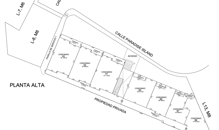 La planta alta comprende los departamentos en su ala izquierda A5, A6, A7 y en su ala derecha B5, B6, B7 y B8.